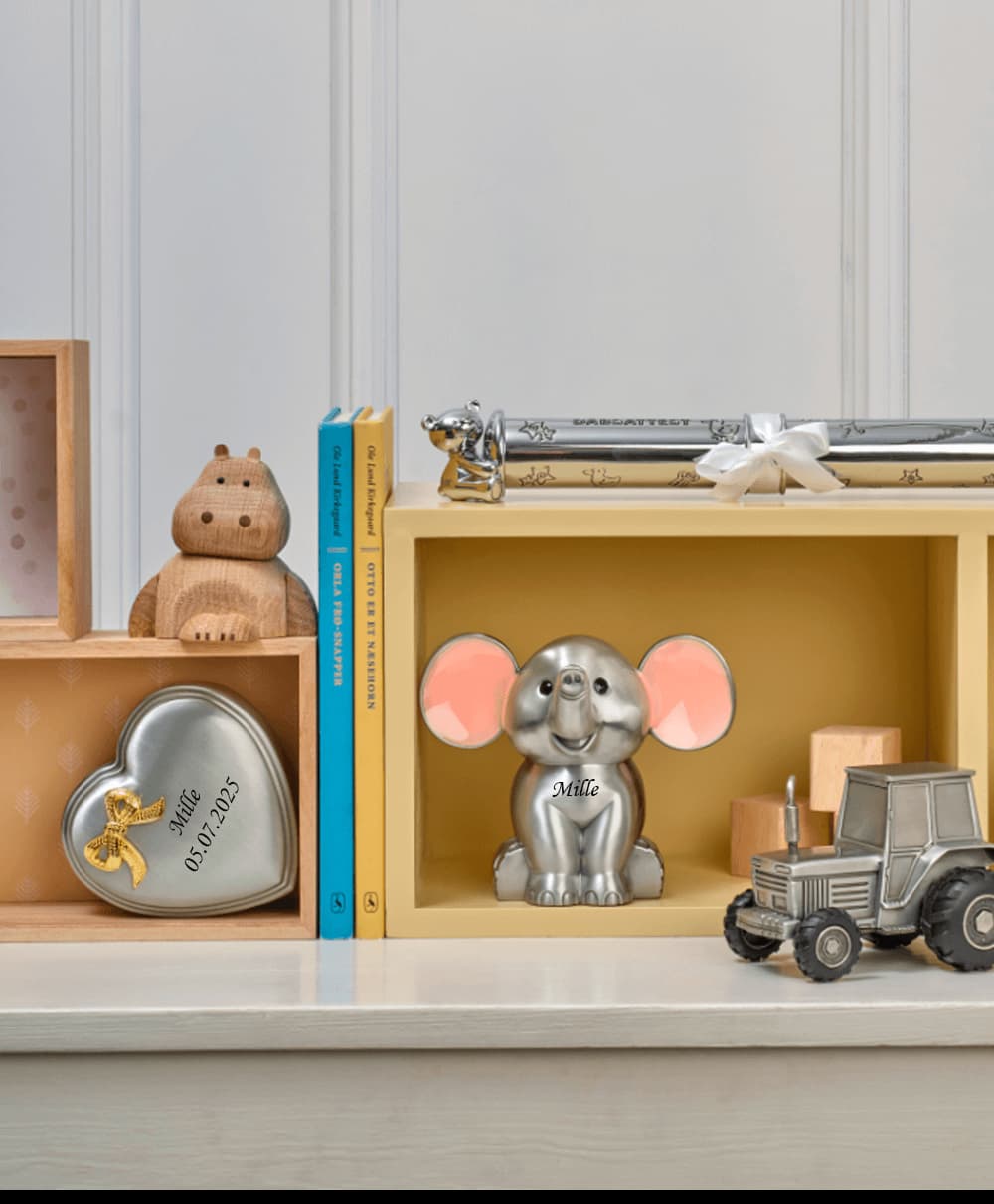 Barnedåben er en oplagt anledning til at give en personlig dåbsgave, der kan følge barnet hele livet. Hos Dahls Gravering er vi specialister i graveret dåbsgaver, og dette er en af vores mest populære kategorier, derunder er Georg Jensen dåbsgaver specielt populære. En indgraveret sparegris, herunder er den kendte Georg Jensen Moneyphant yderst populær, smykkeskrin eller en af de mange flotte træfigurer fra Kay Bojesen træfigur er oplagte dåbsgaveidéer, der kan bringe glæde for barnet, men også forældrene, der kan se på et minde fra en dejlig dåbsdag. Vi har også klassiske dåbsgaver i sølv som smykkeskrin til første hårlok og tand og dåbsrør, der kan bruges til at opbevare dåbsattesten, eller bordflag, børnebestik samt dåbstallerken & dåbskrus som barnet kan bruge, mens det vokser op, men som også er et dejligt minde for livet. Af andre dåbsgave kategorier kan vi nævne: dåbsgaver til hende, dåbsgaver til ham, dåbssmykker, dåbsrør, dåbsflag, fotoramme, gæstebog til barnedåb, bamse med navn, og nusseklud med navn.