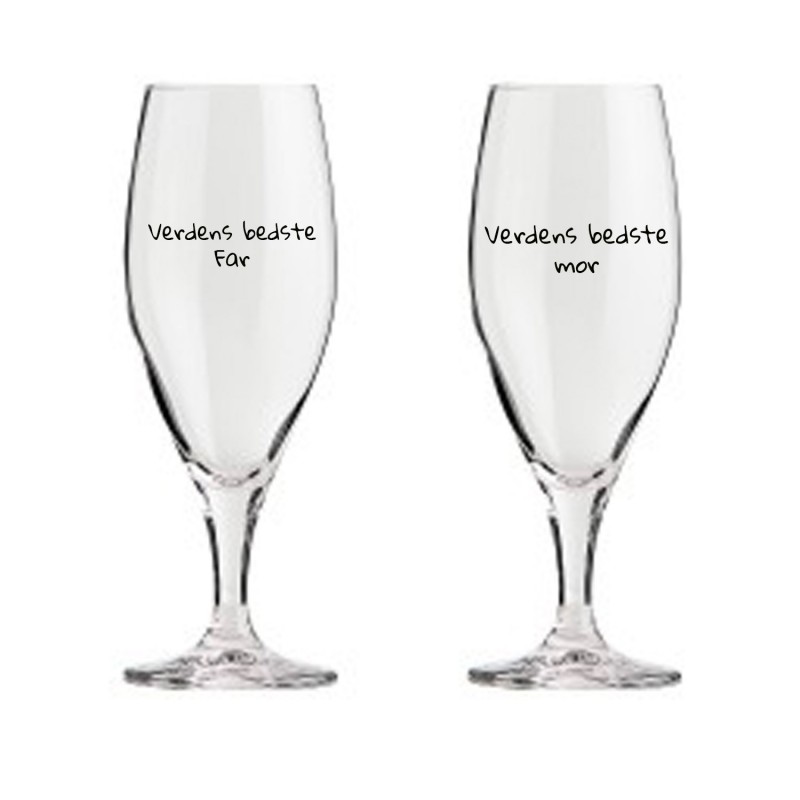 Ølglas fra Aida design leveres med 2 stk i en pæn sammenpakke . Ølglas kan indgraveres med hver sin tekst, som kan være alt fra en sød lille hilsen til verdens bedste far - her er det kun fantasien der sætter grænser. Her kan alle vores skrifttyper anvendes og ca 50 tegn pr glas. Glassene kan indholde 40 cl og sælges kun i pakke af 2 stk. Teksten vil blive lasergraverede ind og fremstå i let hvid farve og vælger du motiv, vil dette komme øverst over tekst. Ønskes der anden opsætning så skrive det som kommentar  til os og vi opfylder dit ønske. Ved valg af navn og dato, vil det altid komme i 2 linjer centrede under hinanden.