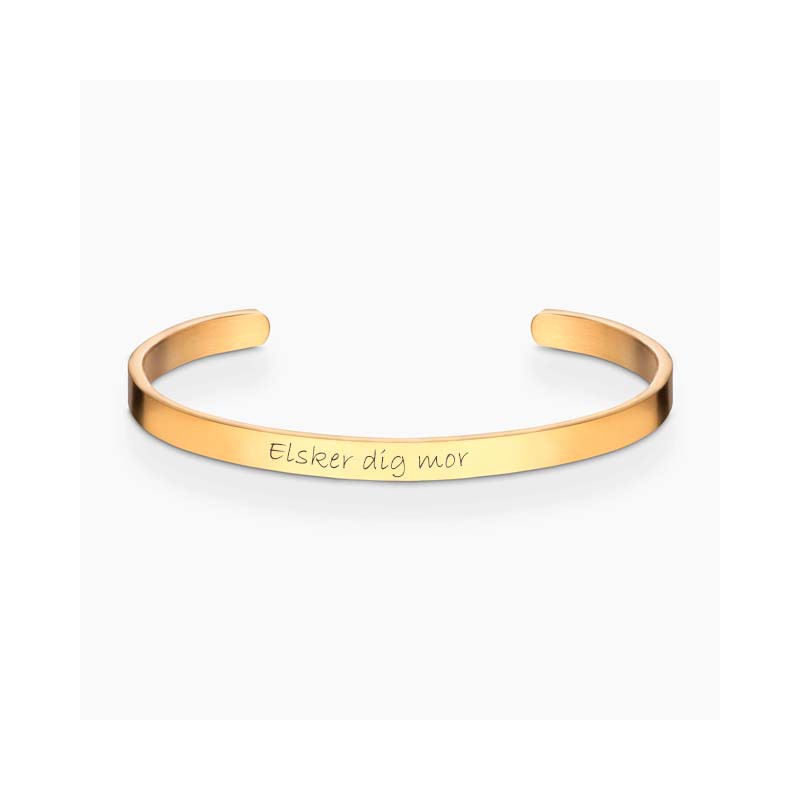 Armring lavet af forgyldt sølv med en diameter på 62 mm, en bredde på ca 6 mm og en blank overflade. Her kan du få indgraverede en personlig tekst på forsiden og ca 20 tegn på 1 linje. Her anbefaler vi Ariel eller Bradley som skrifttype. Teksen vil fremstå i let sort farve. En sådan armring kunne være en elegant og personlig smykkegave eller et stilfuldt tilbehør til enhver lejlighed