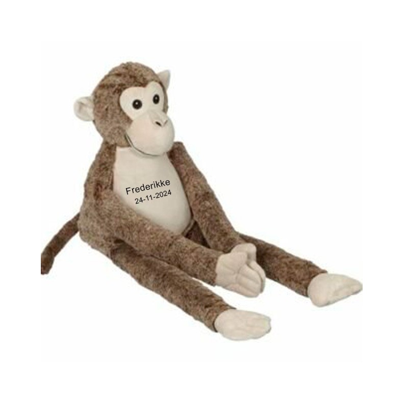 En blød abe med lange arme, broderet med et navn og dato, der måler 75 cm, ville være en perfekt gave til dåb eller barsel. Det er en sød og personlig gave, som børn vil elske at kramme og holde af i lang tid. Broderingen på maven kan være lige fra navn, dato eller med forskellige data på barnet som dåbsgave. En kramme bamse som vil kunne holde i mange år og altid vil være personlig.