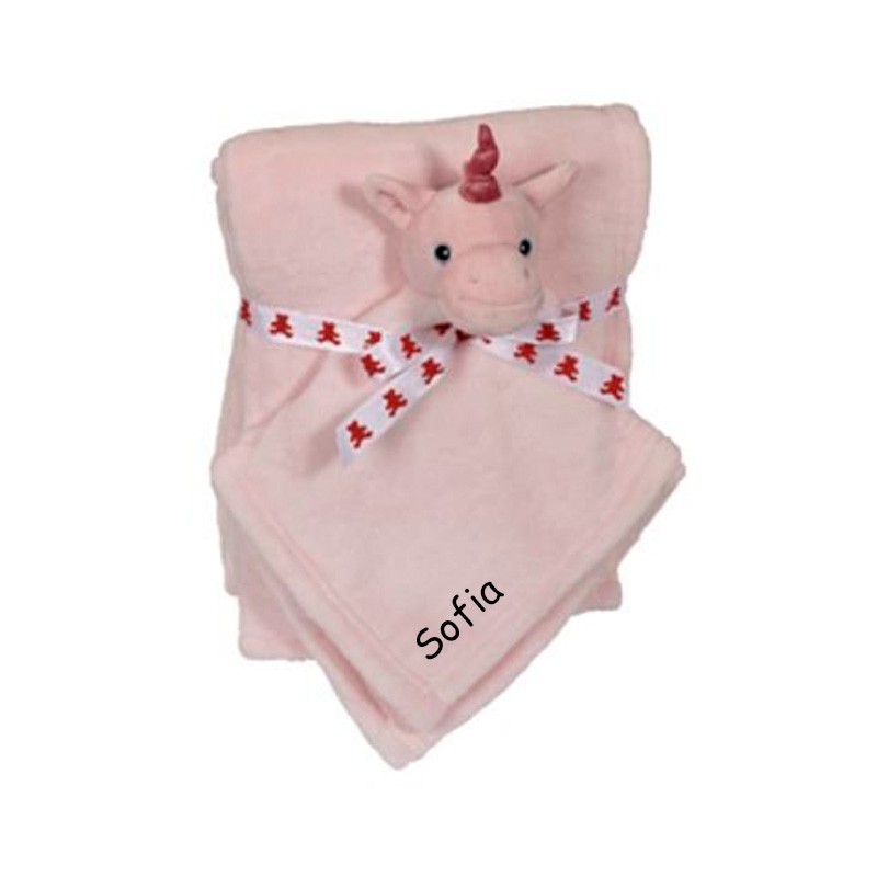 tlf. 20 33 76 60Lækkert blød lyserød tæppe med Enhjørning nusseklud. Tæppet måler 75 x 100 cm og Enhjørning 41 cm . Både tæppe og enhjørning kan broderes med et navn. Vi brodere teksten med sort farve, så det er læseligt og pænt. Begge dele kan tåle at blive maskine vaskede, så når det er for nusset kan blive rent og fint igen. Den perfekte gave til den lille nye pige eller til babyshower. Er sikker på at det vil blive godt brugt når den lille nye skal sove.