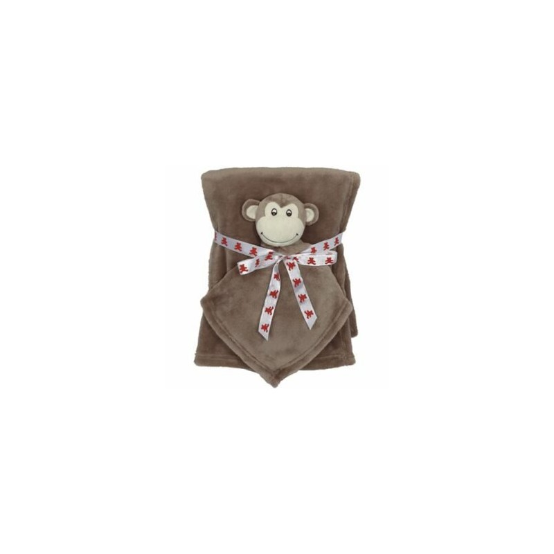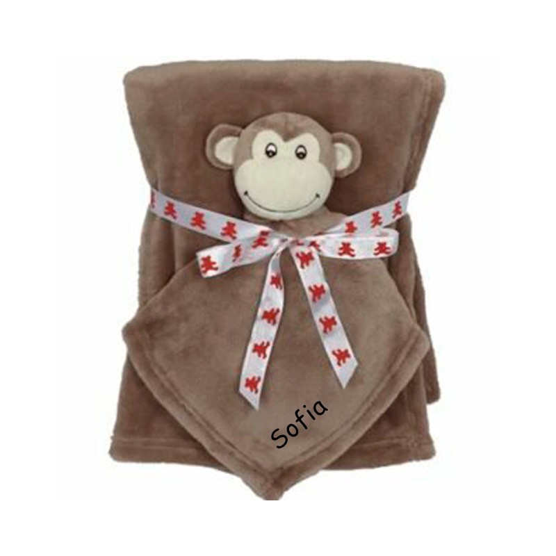 tlf. 20 33 76 60Lækkert blød brun tæppe med abe nusseklud. Tæppet måler 75 x 100 cm og abe 41 cm . Både tæppe og abe kan broderes med et navn. Vi brodere teksten med farve, så det er læseligt og pænt. Begge dele kan tåle at blive maskine vaskede, så når det er for nusset kan blive rent og fint igen. Den perfekte gave til den lille nye pige, dreng eller til babyshower. Er sikker på at det vil blive godt brugt når den lille nye skal sove.