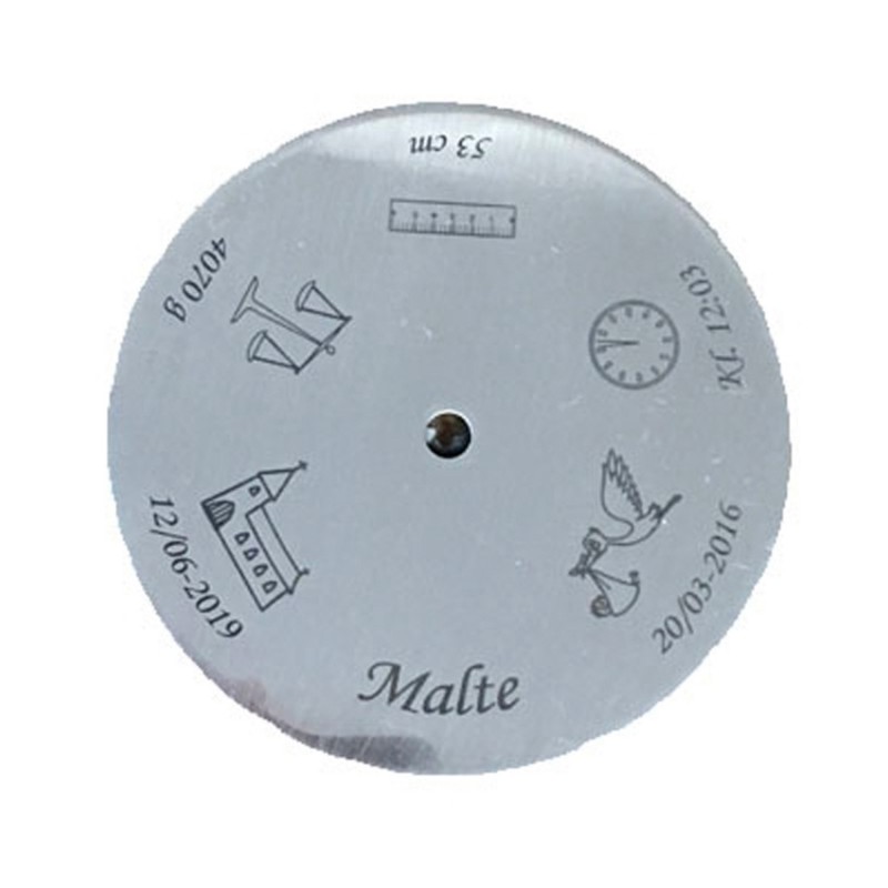Flot Stål bordflag fra Zone. Bordflaget bliver graverede med sorte motiver og under hver motiv kan du få dine personlige data. Hver år til fødselsdag, kan man der ved huske hvor lille man har været da man blev født. Der er mulighed for indgravering af Navn, fødselsdag, dåbsdato, længde, vægt og klokken. Her anbefaler vi alle vores skrifttyper. Bordflaget måler 41,5 cm og leveres i æske. En sikker gave som vil bevares i mange år frem.
