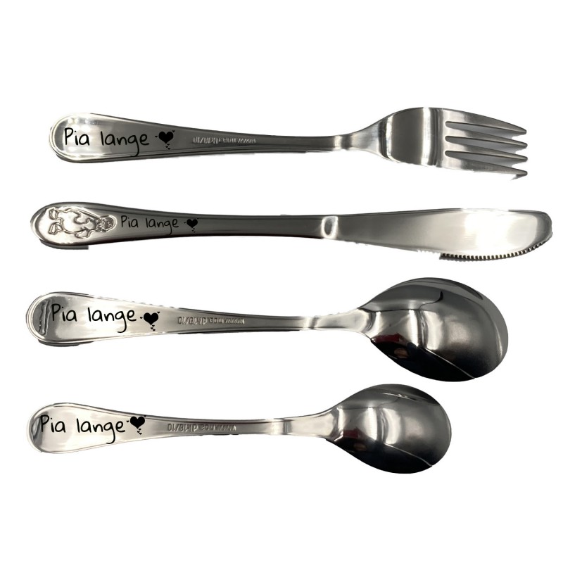 Børnebestik som kan graveres bagpå med barnets fornavn samt dato og vi anbefaler Ariel eller cosvia som skrifttype.Da der er print af Pingo på begge sider af kniv, vil graveringen udføres længere oppe på skaftet. Teksten vil blive lasergraverede og fremstå i let sort farve. Her anbefaler vi ca 20 tegn pr del. Det perfekte børnebestik til dit barn som skal lære at spise selv. Stål børnebestik er veludført til barnet og ligger godt i hånden og med den kendte figur Rasmus klump som er graverede ind i bestikket, er det bare endnu sjovere for barnet at spise selv. Børnebestikket består af 4 dele og er en god gaveidé til fødselsdag, barselsgave eller som dåbsgave. Leveres i æske, så det er klar som gave.