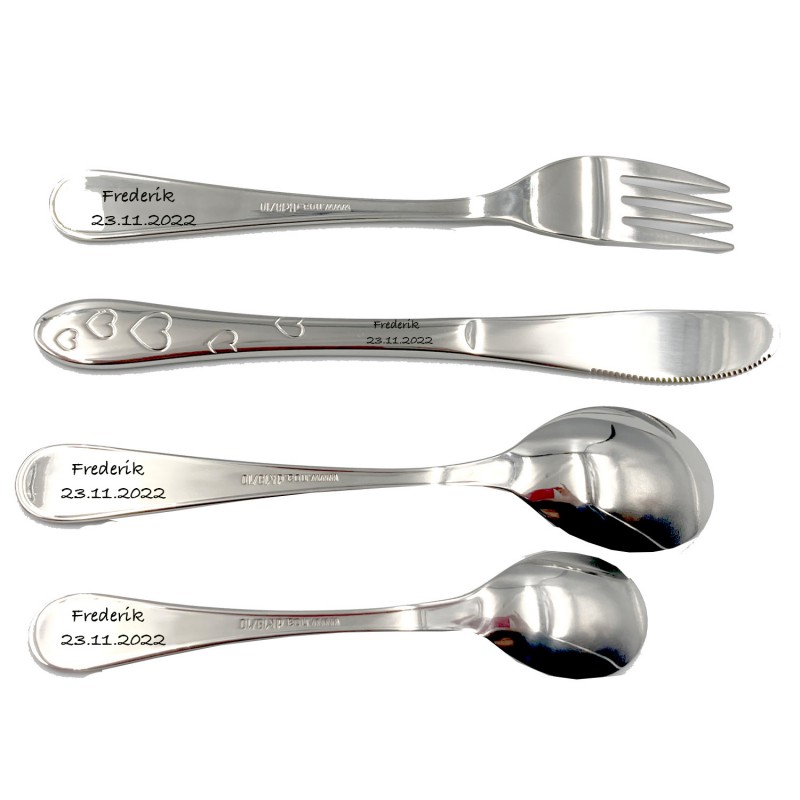 Bestikket er i stål og kan lasergraveres med din personlige tekst på bagsiden og den vil fremstå i let sort farve. Her anbefaler vi Ariel eller Cosivia som skrifttype og ca 25 tegn pr del. Ønsker du et lille motiv sammen med din tekst, kan dette tilføres. Da der er hjerter på begge sider af kniv, vil teksten påfører længere oppe på skaftet. Bestikket er i rustfrit stål og kan tåle maskineopvask. Leveres i fin æske, så det er klar til at give som gave.