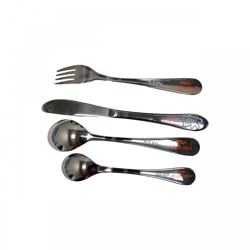 Et sjove og flot blank børnebestik med søde små Teddy bamser. Børnebestikket kan lasergraveres med din personlige tekst bagpå og den vil fremstå i let sort farve. Her anbefaler vi alle vores skrifttyper dog max 25 tegn pr del. Ønskes der et lille motiv til din tekst kan det nemt tilføjes. Bestikker er udført i rustfrit stål og kan tåle maskineopvask. Det leveres i fin æske så det er klar til at give som gave.