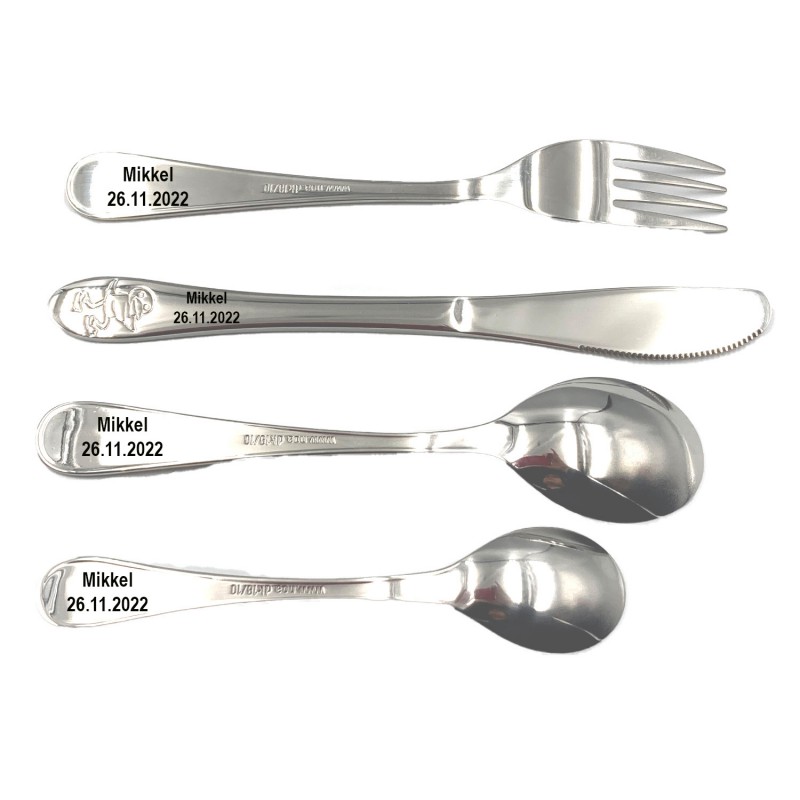 Børnebestik kan graveres bagpå med din personlige tekst. Børnebestikket har 4 dele som alle bliver graverede.Da der er print af Kylling på begge sider af kniv, vil graveringen udføres længere oppe på skaftet. Bestikket vil blive lasergraverede og fremstå i let sort farve. Her kan alle vores skrifttyper anvendes dog ca 20 tegn pr del. Ved valg af motiv vil det komme i forlængelse af enden navn eller dato.Ved valg af længere tekste end 20 tegn vil teksten fremstå mindre og være lidt mindre læselig. Det perfekte børnebestik til dit barn som skal lære at spise selv. Stål børnebestik er veludført til børn og ligger godt i hånden og med de kendte figurer fra Bamse & Kylling som er graverede ind i bestikket, er det bare endnu sjovere for barnet at spise selv.