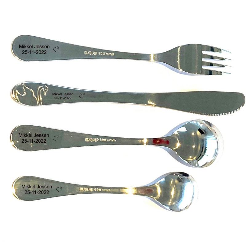 Enkelt og stilfuldt børnebestik med eventyr tegninger fra den grimme ælling. Eventyr bestik kan lasergraveres på bagsiden med din personlige tekst og den vil fremstå i let sort farve. Er gaven til dåb, er det typisk dåbsdatoen man indgravere. Bestikket består af 4 dele og er i rustfrit stål, som gør det kan tåle maskinopvask. Her kan alle vores skrifttyper anvendes og ca 25 tegn pr del. Ved kniv er der motiv på begge sider og graveringen vil stå lidt længere oppe på skaftet. Bagpå bestikket er der fortrykt firmastempel, som er en dansk lovgivning. Dette børnebestik leveres i fin æske, så er det lige til at give som gave.