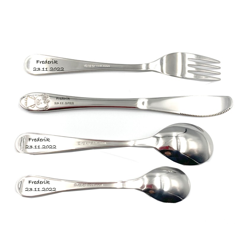 Et sjove og flot blank børnebestik med søde små Teddy bamser. Børnebestikket kan lasergraveres med din personlige tekst bagpå og den vil fremstå i let sort farve. Her anbefaler vi alle vores skrifttyper dog max 25 tegn pr del. Ønskes der et lille motiv til din tekst kan det nemt tilføjes. Bestikker er udført i rustfrit stål og kan tåle maskineopvask. Det leveres i fin æske så det er klar til at give som gave.