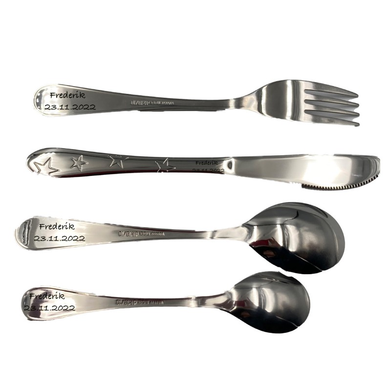 Bestikket består af 4 dele som alle har præ af stjerne. Bestikket kan lasergraveres med din personlige tekst og den vil fremstå i let sort farve. Her anbefaler vi Ariel eller Cosivia som skrifttype. Der kan ca være 25 tegn på hver del bestik og ønsker du et lille motiv kan dette tilfører din tekst. Da der er print på begge sider af kniv, vil graveringen blive påført længere oppe på skaftet. Bestikket er i rustfrit stål og kan tåle maskineopvask. Her får du et fint sæt bestik, der leveres i gaveæske, så det er klar til at give som gave.