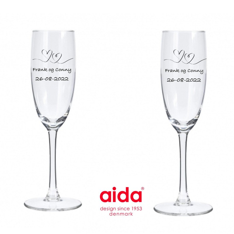 Så design dine egne champagneglas med tekst og måske et lille motiv. Teksten vil fremstå i let hvid tekst og vi gør opmærksom på at vi justere på dit design, så glasset bliver perfekt graverede. Her kan der ca være 25 tegn pr glas og alle vores skrifttyper kan anvendes. Champagneglas måler 19,5 cm i højden, kan indeholde 21 cl pr glas og kan tåle maskinopvask. Sælge kun som 2 stk og leveres ikke i æske.
