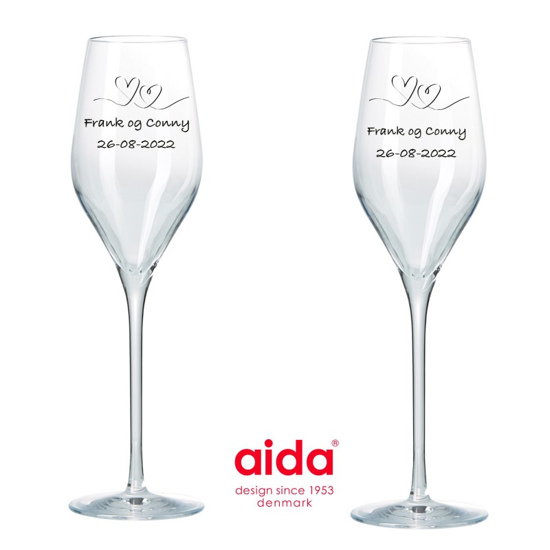 Champagneglas fra Adia design er pakket i en æske med 2 stk, som kan indgraveres med egen tekst. Her vil tekste fremstå i let hvid farve og ønskes motiv, vil dette komme øverst på glasset. Ved valg af dato og navn, vil det komme i 2 linjer, centrede.Glassene kan indholde 26,5 cl i hver glas. Elegant glasserie til enhver lejlighed. Connoisseur glassene er produceret i højeste blyfri stærk og strålende klar “crystalline” kvalitet i Tyskland.