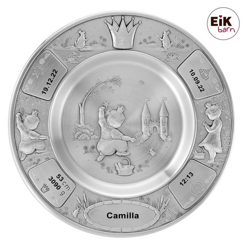 Flot og kraftig tin tallerken med billede af Prinsesse og slottet. Her er der forskellige graveringsfelter, som kan udfyldes med dine data. Her kan du få navn, født, dåb, klokken, vægt og længde indgravering. Teksten vil blive lasergraverede og fremstå i let sort farve. Bagpå tin tallerken er der en krog, så den kan hænge på væggen. Leveres i fin æske, så den er lige til at give som gave.