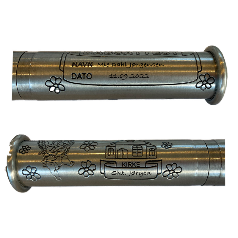 Dåbsrør bliver en meget personlig gave til den lille ny med indgravering af navn, dåbsdato samt kirke. Vi anbefaler skrifttyper som Ariel eller Cosivia.Teksten vil blive lasergraverede og fremstå i let sort farve. Et dåbsrør består af et cylindrisk rør der er fremstillet i fortinnet materialer.Røret kan åbnes i enden og benyttes typisk til at indeholde og bevare barnets dåbsattest. Det måler 240 x 55 mm og det fortinnet look gør det ikke skal pudses.