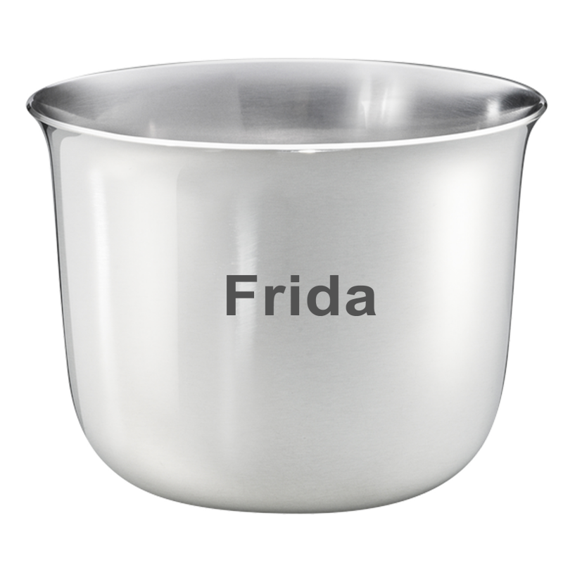 Børne kop har tryk af en and på forsiden. Børnekoppen er udført i rustfri stål og måler 6 cm i højden og 7 cm i diameter. Børnekoppen kan indgraveres med navn samt dato i 2 linjer bagpå. Vi anbefaler skrifttype Ariel eller cosivia og ca 30 tegn fordelt på 2 linjer. Teksten vil fremstå i sort farve. Med den dejlige runde kant foroven, er den yders velegnet som barnets første kop. Leveres i fin æske. så den er klar som gave.