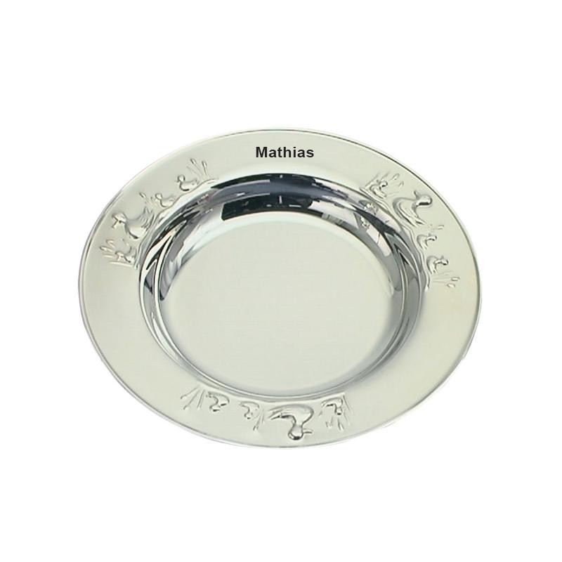 Klassisk sølvtallerken med motiv af ænder på kanten. En utrolig fin, dekorativ og brugbar genstand, barnet kan bruge i mange år frem. Tallerkenen vil uden tvivl blive brugt flittigt og barnet vil synes det er sjovt med sin helt egen tallerken ved spisebordet. Giv en personlig tallerken til barnet i dåbsgave, navngivningsgave eller til fødselsdagen. Teksten vil blive lasergraverede og fremstå i let sort farve og der kan ca. være 40 tegn fordelt på 2 linjer.. Vi anbefaler alle vores skrifttyper til denne dåbstallerken. Den leveres i æske, så den er klar til at give som gave til dåb eller barselsgave. En fin gave til den lille ny og med et stål bestik, som ekstra gave er den et sikkert hit.