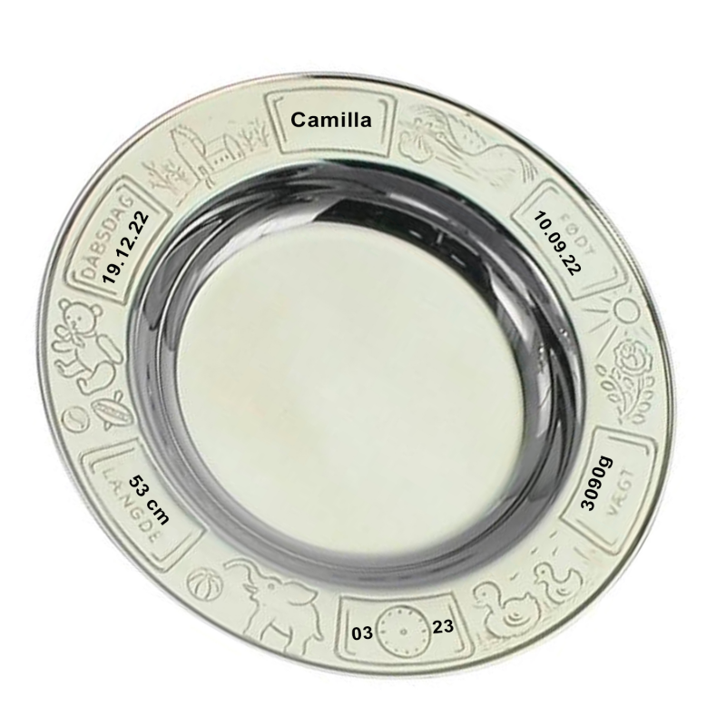 Fin stål tallerken med mulighed for indgravering af barnets data. Tallerken er lavet i stål og kan tåle maskineopvask. Få indgraverede barnets fornavn, fødselsdato, dåbsdato, kl, længde og vægt runde i de forskellige motiver på kanten af dåbstallerken. Her bliver teksten lasergraverede og fremstå i sort farve. Vi anbefaler Ariel som skrifttype. En sjov tallerken der kan bruges til alle måltider og som kan huske barnet på hvor lille og fin man har været.