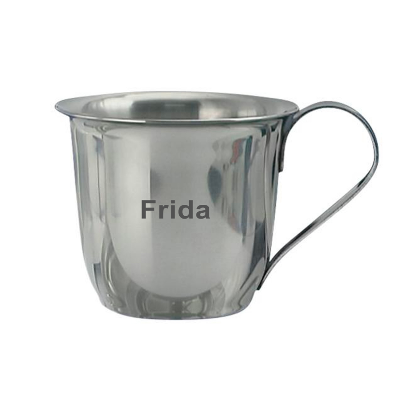 Børnekoppen er udført i rustfri stål og måler 6 cm i højden og 7 cm i diameter. Med den dejlige runde kant foroven, er den yders velegnet som barnets første kop. Børnekoppen kan indgraveres med egen tekst på forsiden af koppen. Her anbefaler vi Ariel eller Cosivia som skrifttype og ca 40 tegn. Teksten bliver lasergraverede ned i og fremstå i sort. Den leveres i æske så den er klar som gave til den lille ny.