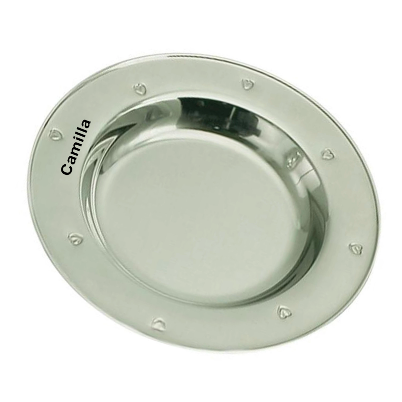 Stål tallerken måler ca 180 mm i diameter og kan indgraveres på kant med din egen tekst. Her anbefaler vi Ariel eller cosivia som skrifttype. Der kan ca være omkring 40 tegn fordelt på 2 linjer. Teksten vil blive lasergraverede og fremstå i sort farve. En sød tallerken til den mindste der skal til at lære at spise selv. Den kan tåle maskinopvask. Tallerken leveres i æske, så den er klar som gave.