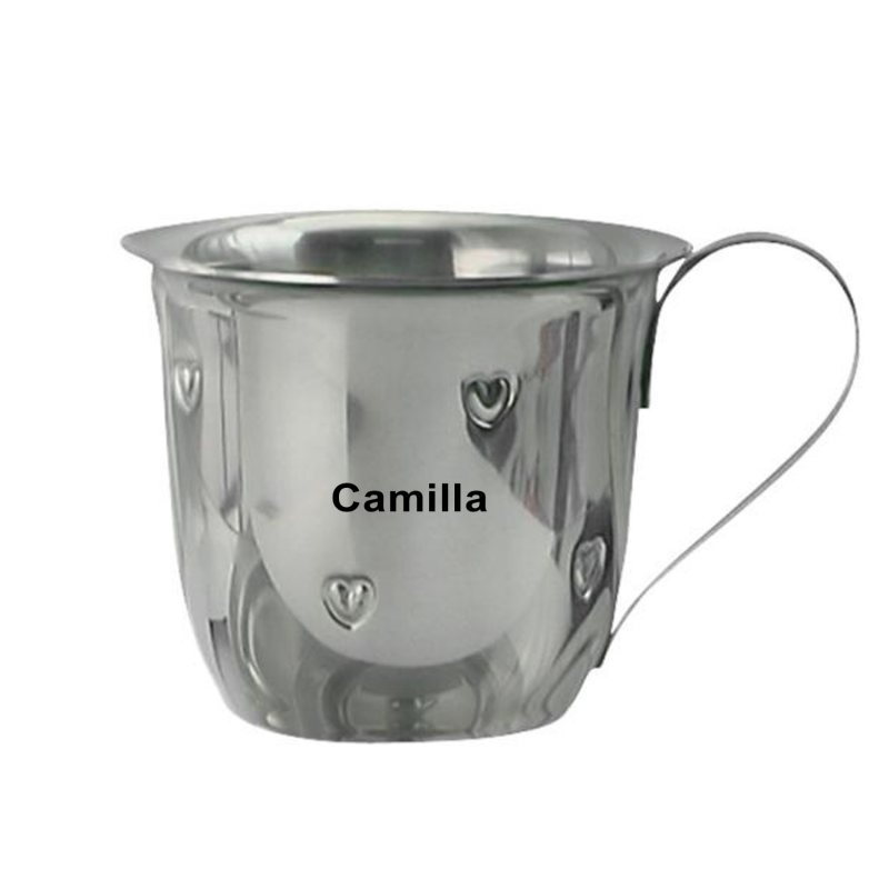 tlf. 20 33 76 60Stål kop fra Nordahl Andersen med hjerter rund på kant. Stål kop måler ca 65 mm i højden x 70 mm i diameter. Koppen kan indgraveres i mellem hjerterne. Her anbefaler vi Ariel eller cosivia som skrifttype og ca 40 tegn. Teksten bliver lasergraverede og fremstå i sort farve. Børnekruset kan tåle maskinopvask og kommer i fin æske, så det er klar som gave til den lille ny.
