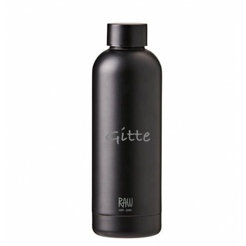 Vær opmærksom på, at der kan forekomme mindre farveforskelle i graveringen sammenlignet med den viste model på billedet. Dette skyldes variationer i materialet og overfladen på hver enkelt termoflaske, som kan påvirke, hvordan graveringen fremstår. Graveringen vil dog altid stå i skarp kontrast til den sorte overflade og fremhæve et elegant, sølvfarvet look.