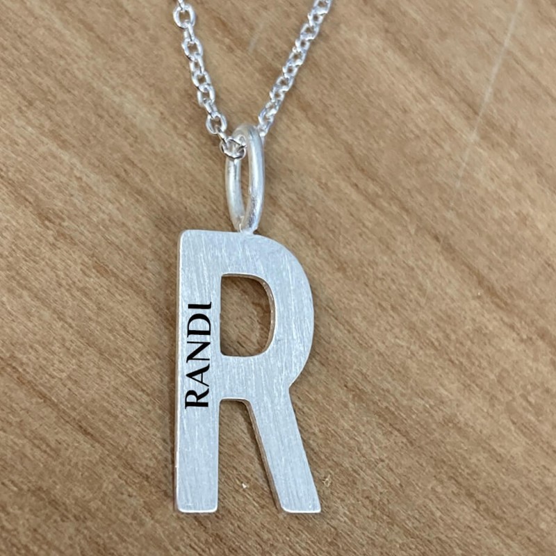 R bogstave i sølv er en enkelt og flot sølv bogstave vedhæng. Vedhænget kan lasergraves med egen tekst på siden og her kan der ca være 10 tegn. Teksten vil blive lasergraverede og fremstå i let sort farve. Her kan alle vores skrifttyper anvendes, men vi anbefaler Ariel som bliver mest læselig.R- vedhænget leveres med kæde i 42 cm og er 15 mm i højden Et flot smykke som leveres i smykkeæske så det er klar til at give som gave.