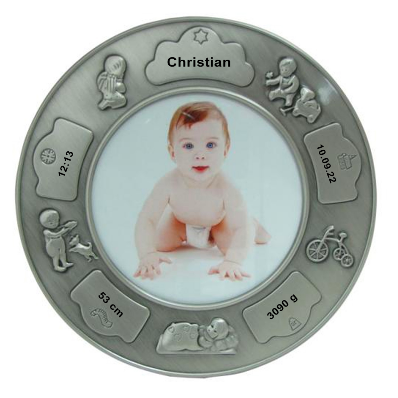 Der er små rubrikker rund på den fortinnet fotoramme hvor de forskellige data som barnets fornavn, fødselsdag, dåbsdag, længde, vægt og kl kan indgraveres i . Teksten vil blive lasergraverede og fremstå i sort farve. Her kan alle vores skrifttyper anvendes. I midt af fotoramme er der plads til et 10 x 10 cm billede. Dette er en rigtig god gaveidé til dåbsgave til den lille nyfødte.
