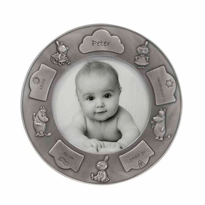 Der er 5 graverings plader, som kan udfylde med dine personlige oplysninger på barnet. Der kan udfyldes med navn, fødselsdato ,klokken , længde og vægt. Dåbsrammen måler 17,5 cm i diameter og er i tin. I midt er der plads til billede af barnet. Teksten vil blive lasergraverede og fremstå i sort farve og her kan alle vores skrifttyper anvendes. En flot ramme til dåb, barselsgave eller babyshower dag. Leveres i æske, så den er klar som gave.