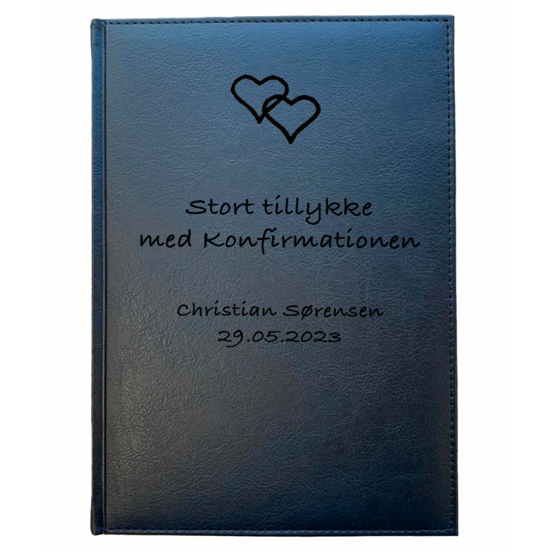 156 sider uden linjer - lige til at skrive i. Denne gæstebog kan indgraveres med lige den tekst som du ønsker og måske en lille personlig tegning. Teksten vil blive præet ned i bogen og fremstå i let sort farve. Gæstebogen er A5 (17,5 x 24,5 cm) og med en lille silkesnor som viser hvor langt man er kommet i bogen. Brug gæstebogen til at fortælle om konfirmationen, billeder af indbydelsen, gæsteliste mm og derved bliver det et evigt minde om den store dag.