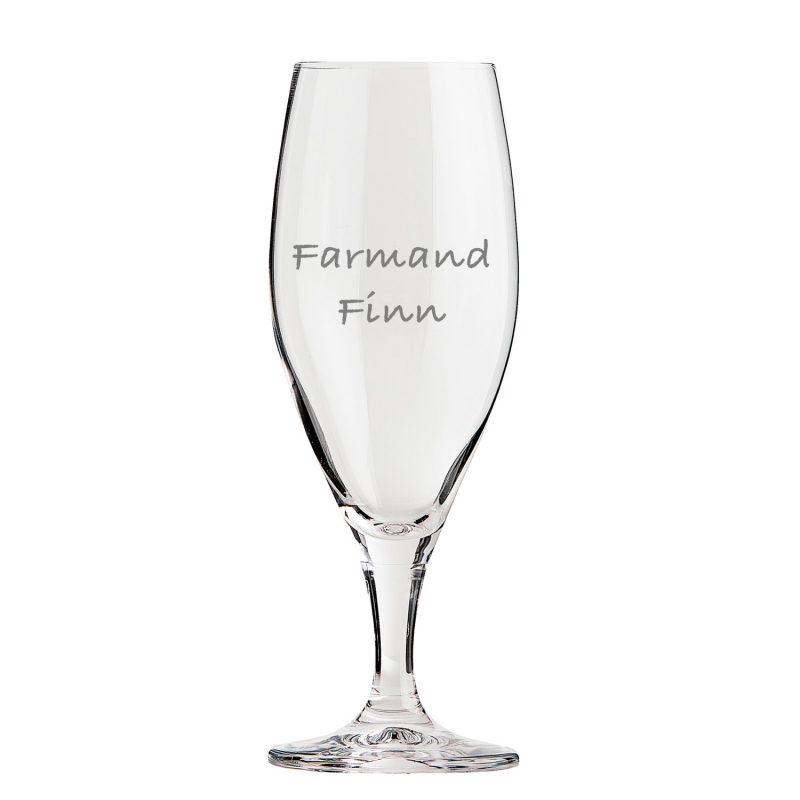 Glasset kan lasergraveres med din egen tekst eller brug en af vores design og skrifttype og gør glasset meget personligt. Vi anbefaler max 50 tegn fordelt på 4 linjer. Teksten vil blive brændt ned i og fremstå i let hvid tekst.