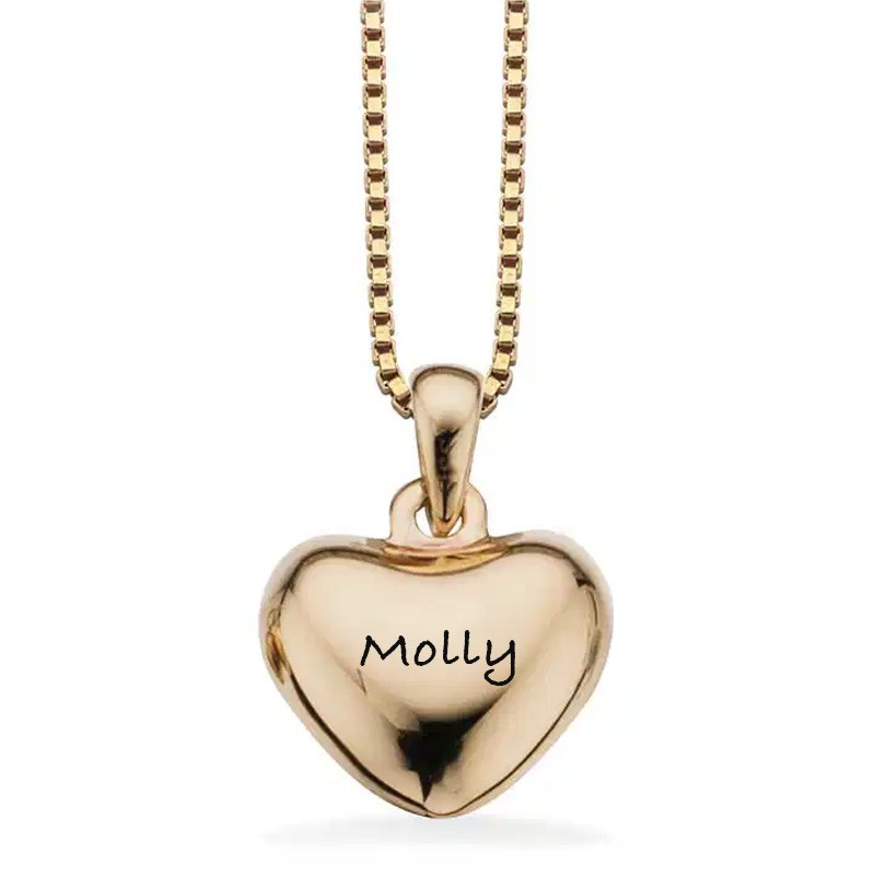 Lille og enkelt forgyldt hjerte som måler 11 x 12 mm. Det forgyldte hjerte leveres med forgyldt kæde. Hjertet kan lasergraveres med en lille og enkelt tekst. Her kan der max være 10 tegn. Teksten vil fremstå i let sort farve.