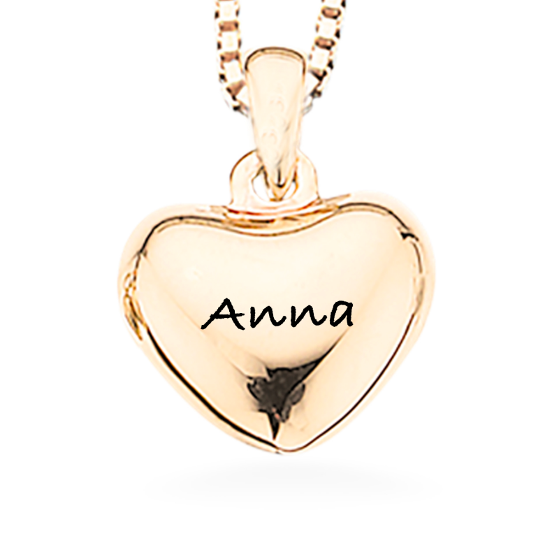 Lille og enkelt forgyldt hjerte som måler 10 x 13 mm. Det forgyldte hjerte leveres med forgyldt kæde. Hjertet kan lasergraveres med en lille og enkelt tekst. Her kan der max være 10 tegn. Teksten vil fremstå i let sort farve.