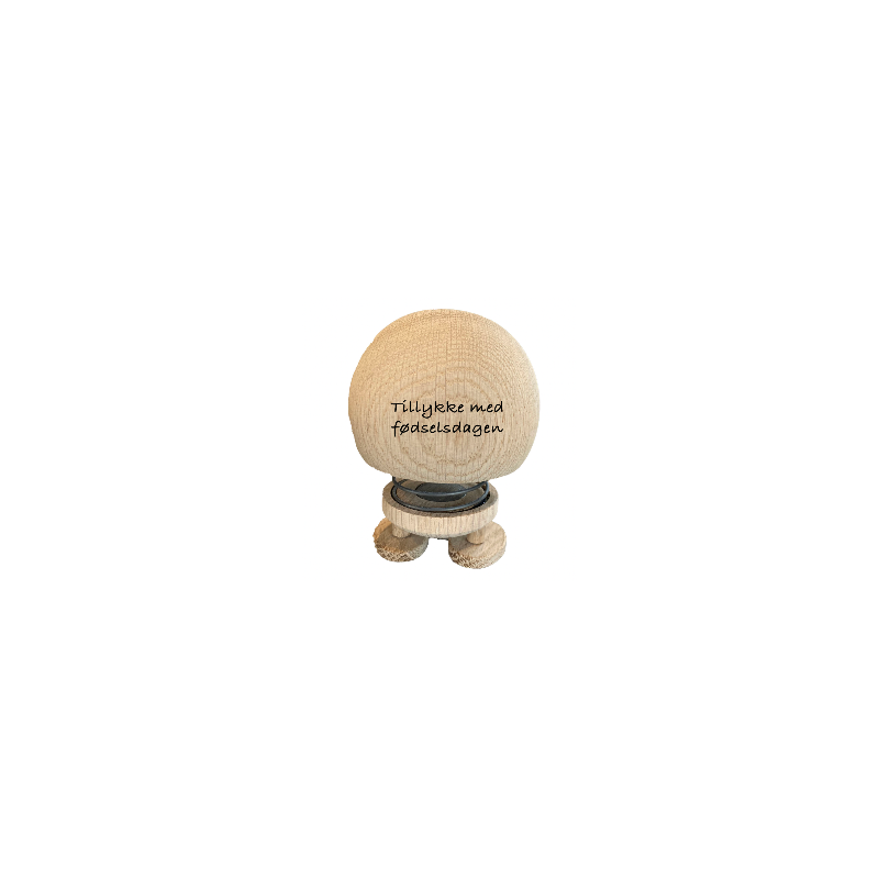 Den glade lille Hoptimist som er lavet i eg, kan lasergraveres på bagsiden med din personlige tekst. Teksten vil blive brændt ned i brændt ned i træet og teksten kan variere lidt i farve, alt efter hvordan træet er. Her anbefaler vi Ariel som skrifttype og ca 40 tegn fordelt på 3 linjer. Da træ er et naturmateriale kan der være knaster og områder med lysere eller mørkere træ, og vi kan derfor ikke garantere at produktet har det præcise udtryk som billedmaterialet viser. Den sjove lille figur er måler H: 13 cm x D: 10 cm og med de glade øjne og den lille tap på hovedet kan den gøre meget glæde i mange hjem. Den leveres i æske, så den. er klar som gav