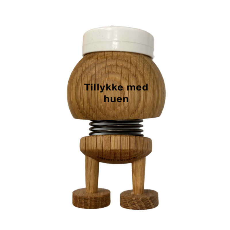 Bimle er den glad lille student i træ som kan lasergraveres med din egen lille tekst på bagsiden. Teksten vil fremstå i let sort farve og her vil vi anbefale Ariel som skrifttype. Der kan a være 20 tegn på denne Hoptimist. Der medfølger et klisterark en mørkerød, mørkeblå, lyseblå og lilla stribe til huen,dækkende STX, HHX, HTX, HF og HG. som man selv montere alt efter hvilke student der skal have Hoptimisten. Den måler ca 7 x 5 cm og leveres i æske, så den er klar som gave.