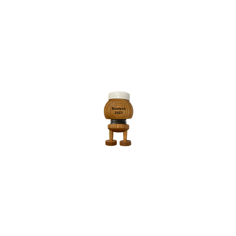 Bumle kan graveres med din egen lille tekst på bagsiden. Teksten vil fremstå i let sort farve og her vil vi anbefale Ariel som skrifttype. Der kan a være 20 tegn på denne Hoptimist. Der medfølger et klister ark en mørkerød, mørkeblå, lyseblå og lilla stribe til huen, dækkende STX, HHX, HTX, HF og HG. Hoptimisten måler H: 8,5 cm, Ø: 7,4 cm x 10,5 cm og leveres i æske. så den er klar som gave