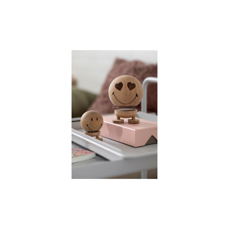Hoptimist Smiley er lavet af ubehandlet egetræ. Hoptimisten kan lasergraveres på bagsiden med en sød lille hilsen. Teksten vil blive brændt ned i træet og fremstå i let sort farve. Da træ er et naturmateriale, kan der være knaster og områder med lysere eller mørkere træ. Vi kan derfor ikke garantere, at produktet har det præcise udtryk, som billedmaterialet viser. Vi anbefaler Ariel som skrifttype og ca 15 tegn fordelt på 2 linjer. Da gravering bliver brændt ned i træet, kan der være ujævnheder i farve alt efter, hvordan træet er. Hoptimisten måler 6,6 cm i højden. En fjeder i midten af hoptimisten gør det muligt, at hoptimisten kan hoppe. Den leveres i fin gaveæske, så den er klar som gave.