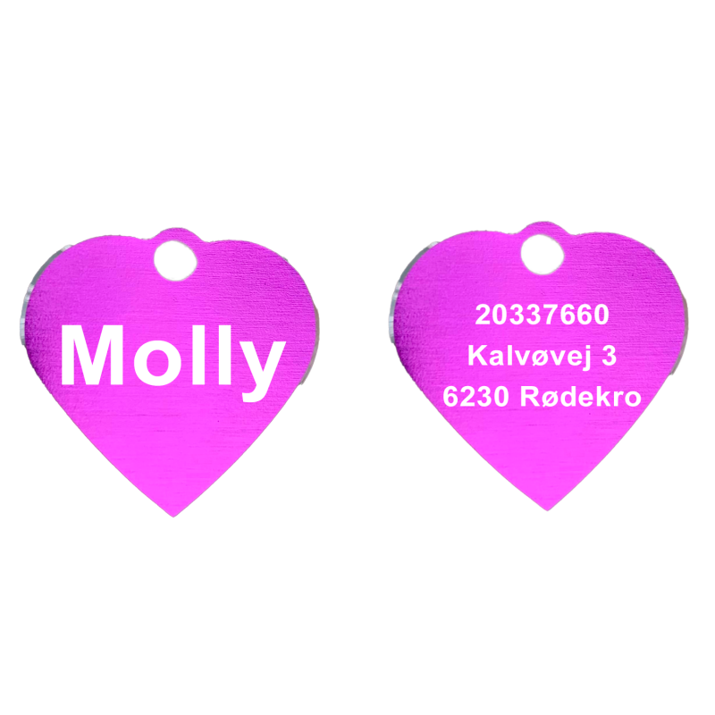 Hundetegnet er formet som et hjerte, i lilla aluminium, kan graveres på 2 sider, teksten bliver lasergraverede og fremstå tydeligt. Design selv dit hundetegn med tekst, her anbefaler vi Ariel som skrifttype og max 5 linjer.