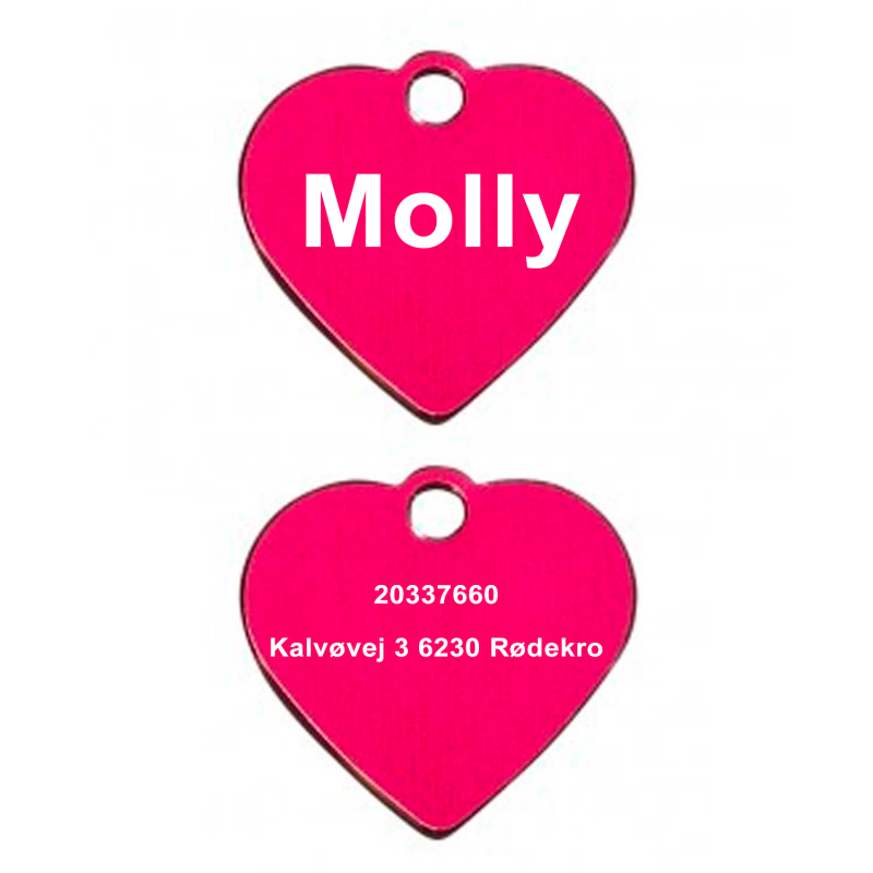 Hundetegnet er formet som et hjerte, i lyserødt aluminium, kan graveres på 2 sider, teksten bliver lasergraverede og fremstå tydeligt. Design selv dit hundetegn med tekst, her anbefaler vi Ariel som skrifttype og max 5 linjer.