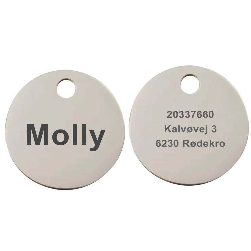 Hundetegnet i rustfrit stål kan graveres på 2 sider, teksten bliver lasergraverede og fremstå tydeligt. Design selv dit hundetegn med tekst, her anbefaler vi Ariel som skrifttype og max 5 linjer.