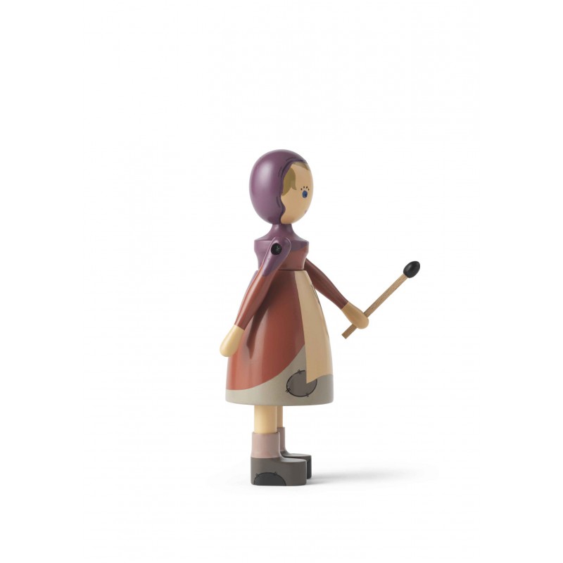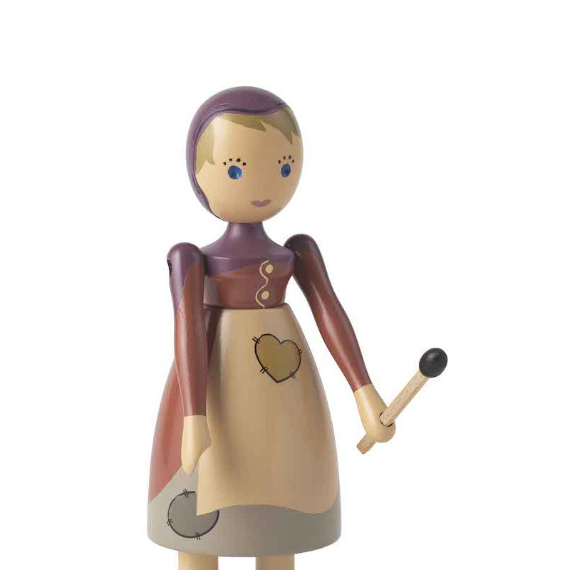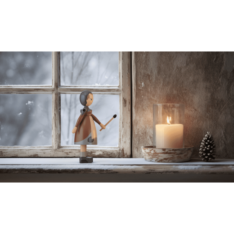 tlf. 20 33 76 60Lad eventyret leve videre gennem originale fortællinger i træ. I Odense åbnede i 2021 museet H.C. Andersens Hus, og i den forbindelse indledte museet og Kay Bojesen Danmark et samarbejde, så det nu ville være muligt at finde nogle af de mest kendte og elskede figurer fra de verdensberømte eventyr fortolket i Kay Bojesens univers af originale fortællinger i træ. Nattergalen, Hyrdinden & Skorstensfejeren og Ole Lukøje var de første til at flytte ind på hylderne i museumsbutikken i Odense – og selvfølgelig også i din lokale designbutik. Og nu har Den lille Pige med Svovlstikkerne også fundet ind i varmen. I Kay Bojesens fortolkning er hun iklædt en hætte, der går ned over skuldrene. Hun har lapper på kjole og forklæde, som er holdt i nedtonede farver, der understreger, at den lille pige kommer fra fattige kår. Hendes lune smil og milde og uskyldige udtryk er affødt af de smukke oplevelser, hun ser for sit indre blik i lyset fra flammerne, hvor hun en kold nytårsaften får vækket fantasien med nogle fantastiske drømmesyn fyldt med glæde og tryghed. I hånden holder hun en svovlstik, der fuldender fortællingen. Den Lille Pige med Svovlstikkerne måler 14,5 cm i højden og er drejet i FSC®-certificeret bøgetræ, og den manuelle produktion med maling og tryk er udført med den store præcision og omhyggelighed, der kendetegner træfigurerne fra Kay Bojesen. Formen er baseret på den originale Lise-figur fra Kay Bojesens arkiv, der er enkel og minimalistisk, men fuld af liv og sjæl. Det giver Den Lille Pige med Svovlstikkerne den følelse af magi og eventyr, der er i tråd med Kay Bojesens ånd og den historiefortælling, han formåede at skabe, når han designede sine fantasifulde figurer.