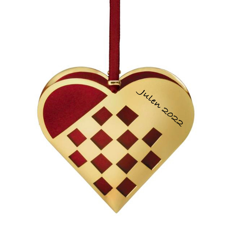 Det flettet julehjerte er ca 20 cm og kan lasergraveres med navn, dato eller din egen tekst. Vi anbefaler Ariel eller cosivia. Julehjertet bliver lasergraverede og teksten vil fremstå i let sort farve. Der kan ca være 25 tegn på hver side af dette hjerte. Julehjertet har et filt indsats og strop, så det kan bruges til juletræet eller som pynt i hjemmet. Lav dit personlige julehjerte og brug det som minde om dit barns første jul eller som minde om en