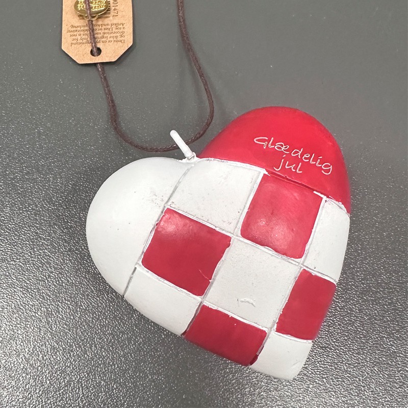 tlf. 20 33 76 60Dette smukke flettede julehjerte er lavet i Polyresin , et holdbart materiale, som giver det et glansfuldt og elegant udseende. Med målene H 6,00 x 6,50 cm og D 3 cm er hjertet en ideel størrelse til at hænge på juletræet eller som en personlig gave.