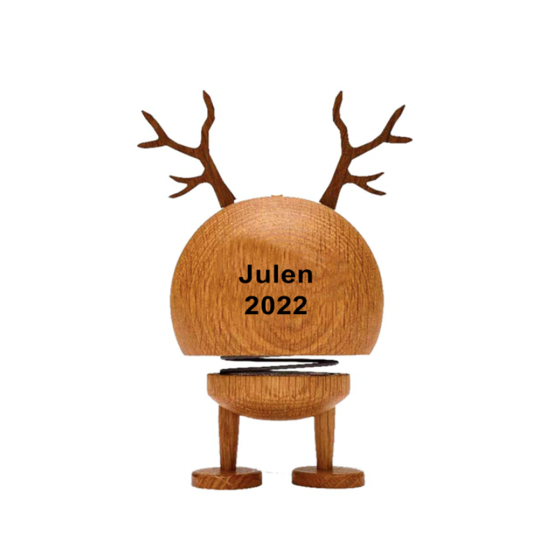 Den lille søde Bimle Hoptimist har gevir som er aftagelig, så den kan stå på hylden året rundt. Her kan du få lasergraverede en lille sød hilsen på bagsiden og ca 20 tegn fordelt på 2 linjer. Teksen vil fremstå i let sort farve, da det bliver brændt ned i træet. Her kan tekst farven varier lidt efter træets natur. Her anbefaler vi Ariel som skrifttype. Hoptimisten måler 9,8 x 13,4 x 8,8 cm og leveres i æske, så den er klar som gave. Da træ er et natur materiale kan der være knaster og områder med lysere eller mørkere træ, og vi kan derfor ikke garantere at produktet har det præcise udtryk som billedmaterialet viser og tager ikke dette som reklamation.