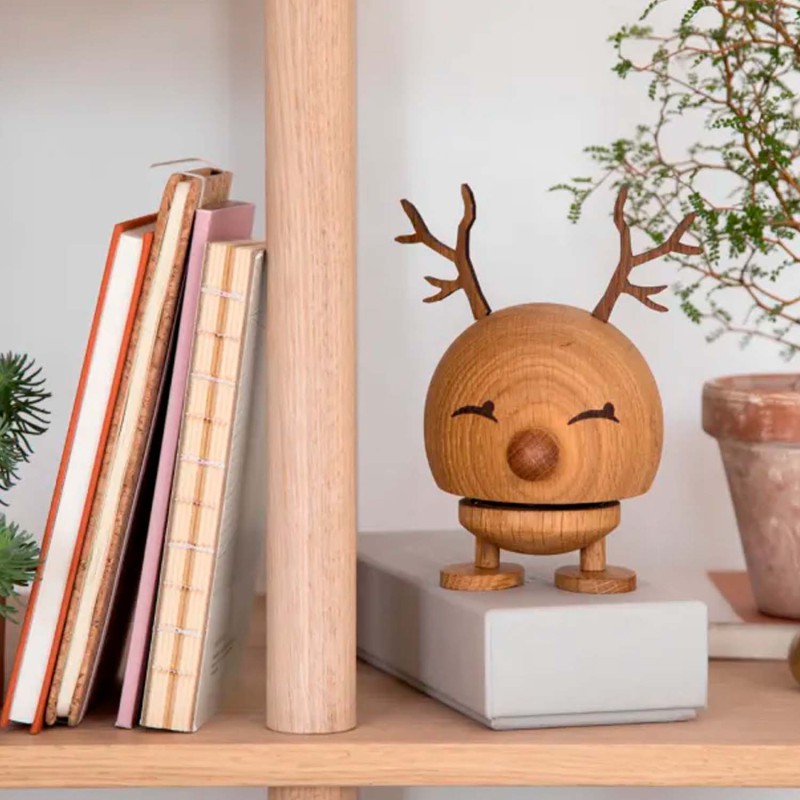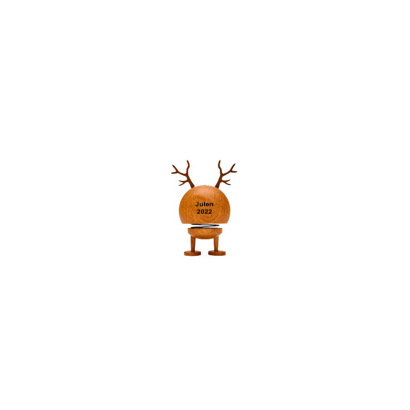 Den lille søde Bumle Hoptimist har gevir som er aftagelig, så den kan stå på hylden året rundt. Her kan du få lasergraverede en lille sød hilsen på bagsiden og ca 30 tegn fordelt på 2 linjer. Teksen vil fremstå i let sort farve, da det bliver brændt ned i træet. Her kan tekst farven varier lidt efter træets natur. Her anbefaler vi Ariel som skrifttype. Hoptimisten måler 10,9 x 12,7 x 17,5 cm og leveres i æske, så den er klar som gave. Da træ er et natur materiale kan der være knaster og områder med lysere eller mørkere træ, og vi kan derfor ikke garantere at produktet har det præcise udtryk som billedmaterialet viser og tager ikke dette som reklamation.