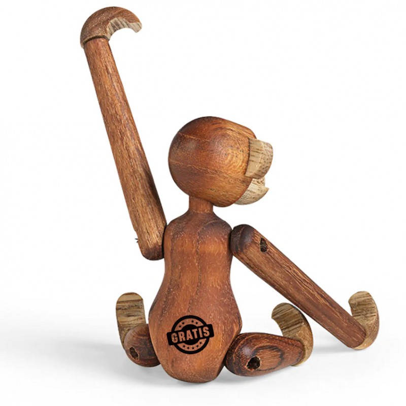 Aben er lavet i teak træ og måler 18,5 cm i højden. Vi tilbyder at få lasergraverede din personlige tekst på bagsiden af aben.