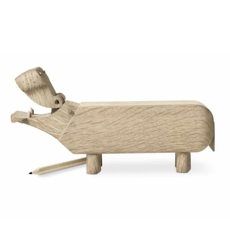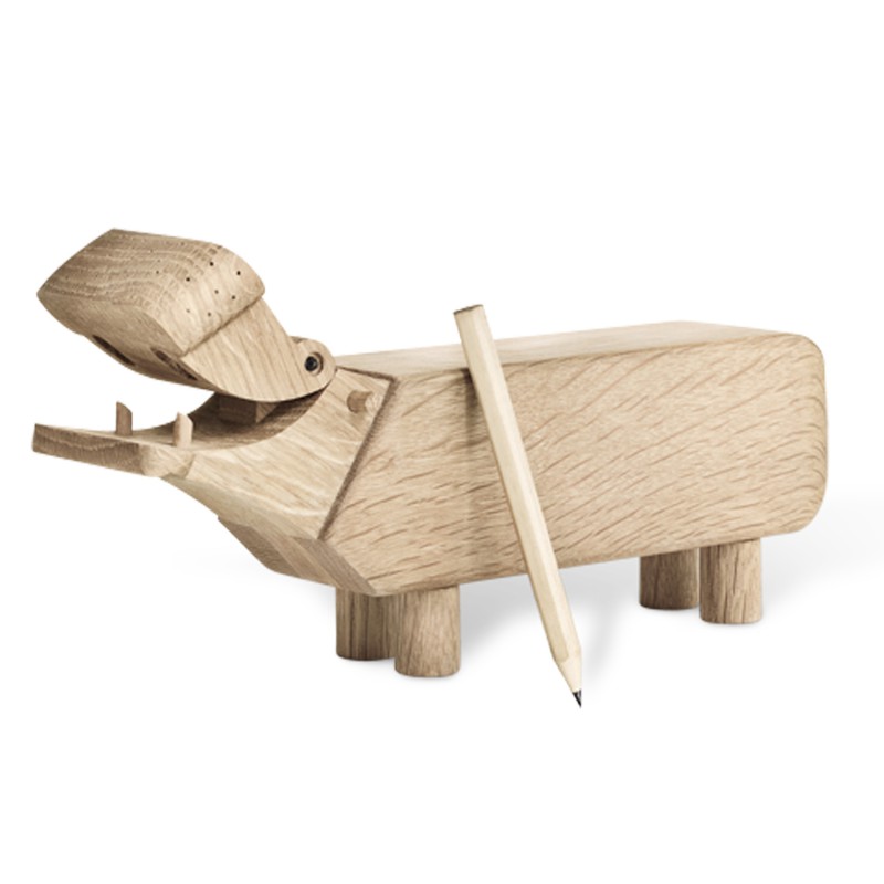 Flodhesten blev født i 1955 som et muntert indslag til at holde styr på blyanten på skrivebordet. Flodhesten kan lasergraveres med egen tekst på siden og teksten vil blive brændt ned i træet og fremstå i let sort farve. Her anbefaler vi Ariel som skrifttype og max 50 tegn fordelt på 3 linjer Flodhesten er i egetræ og måler 21,5 x 9 cm. Der medfølger en lille blyant som kan ligge i munden og blive opbevarede. Træ figuren kommer i original æske, så den er klar til at give som gave.