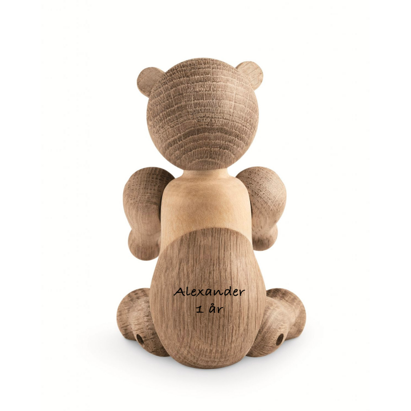og vi anbefaler Ariel som skrifttype - max 20 tegn. Teksten vil blive brændt ned i træet og fremstå i let sort farve. Da træet er ubehandlede, vil det kunne skifte lidt farve efter hvordan den sidder i sollys. Bjørnene leveres i original æske, så den er klar til at give som gave.