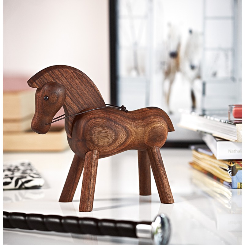 Giv den i gave til hestpigen eller som en sød firmagave til kontoret. Det statslige hest blev designet af Kay Bojesen i begyndelsen af 1930'erne og findes nu igen i produktion af Kay Bojesen Denmark. Hesten er lavet af mørk valnød og har tøjler i læder.Med sin legesyge kontur, blide former og stive ben har hesten et udseende som er typisk for Kay Bojesen trædyr.