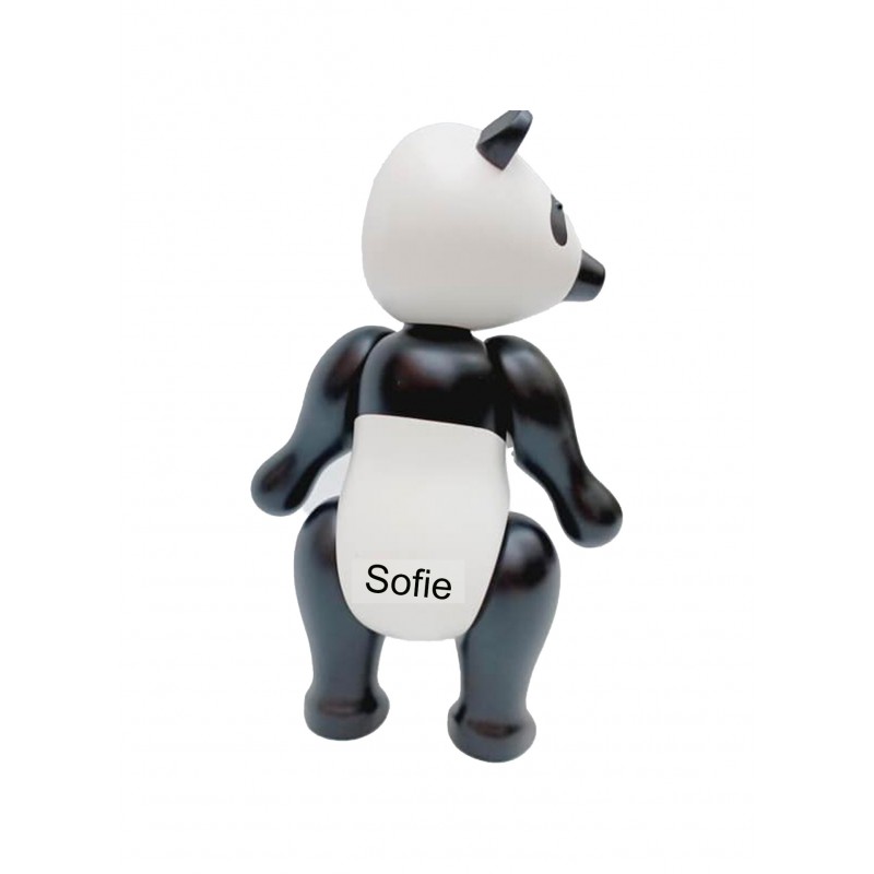 og vi anbefaler Ariel som skrifttype. Teksten vil blive brændt ned i træet og fremstå i let sort farve. Vi anbefaler ca 15 tegn fordelt på 2 linjer. Pandaen er er lavet af bøgetræ og malet med sort og hvid maling. Arme og ben kan justeres, så den både kan sidde og stå op. Pandaen leveres i original æske, så den er klar til at give som gave.