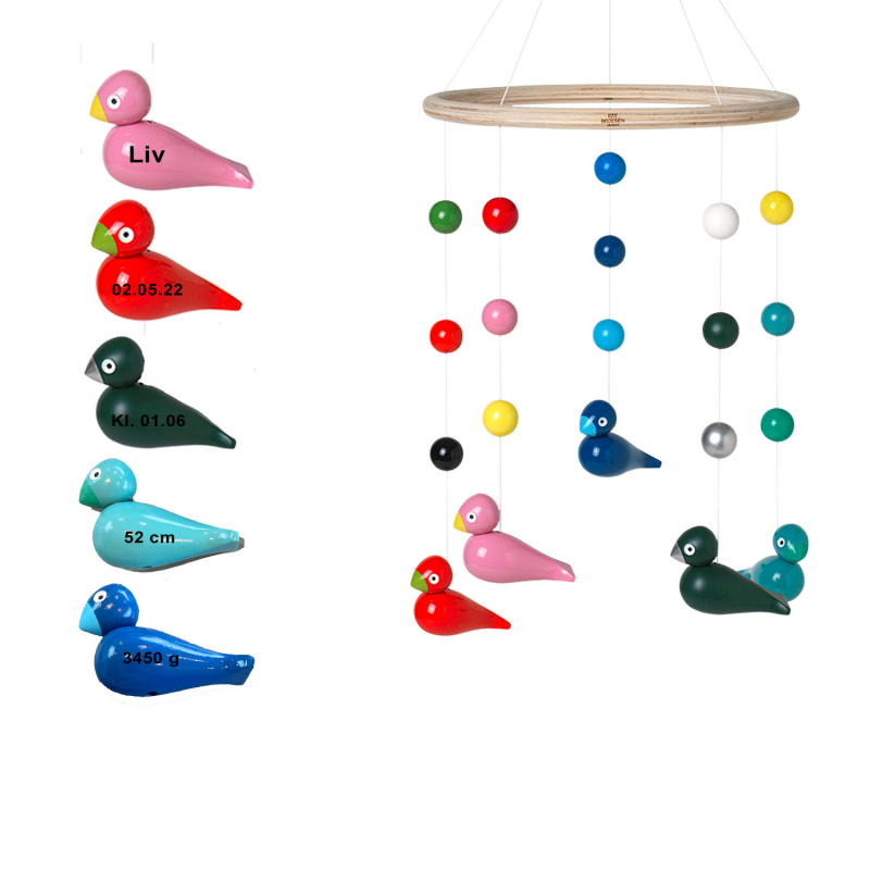 Med de små malet fugle og trækugler i forskellige farver, giver det barnet rigtig meget at kikke på. Her kan i måske få lasergraverede små data i fuglene, som vægt, længe, klokke, dåb og født. Teksten vil blive brændt ned i træet og fremstå i let sort farve. Her anbefaler vi Ariel som skrifttype og ca 10 tegn på hver fugl. Uroen måler 23,5 x 47 mm og hænger med forskellig farver kugler ved hver fugl. Uroen kommer i fin æske, hvor hver fugl ligger i en beskyttet pose. En perfekt gave til dåb, babyshower eller som velkommen til den lille ny. Uroen er dekorativ på børneværelset over puslebordet eller børnesengen og giver familiens mindste ro og noget dejligt at kigge på
